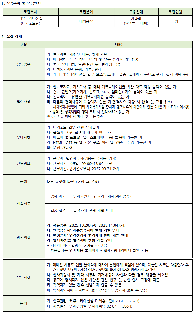 ¡Ø º» °ø°í´Â 'ÈÞÁ÷ ´ëü' ä¿ë °ÇÀ¸·Î °í¿ë³ëµ¿ºÎ ÀÎÀçä¿ò¹ðÅ© Áö¿øÀ¸·Î Á¦À۵ǾúÀ¸¸ç ÆÄ°ßÁ÷ÀÌ ¾Æ´Ñ '»çȸº¹Áö¹ýÀÎ ¹Ð¾Ëº¹ÁöÀç´Ü' ¼Ò¼ÓÀ¸·Î ±Ù¹«ÇÏ°Ô µË´Ï´Ù.