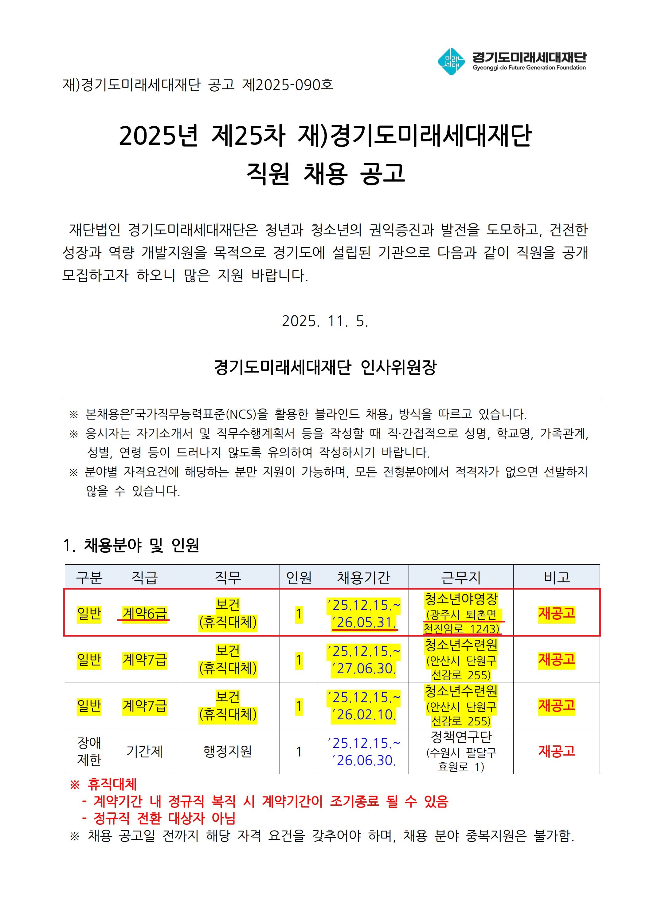 [°æ±âµµ¹Ì·¡¼¼´ëÀç´Ü] 25Â÷ °æ±â ±¤ÁÖ °£È£»ç 1¸í °è¾àÁ÷ ä¿ë°ø°í 11/17(¿ù) 17½Ã (ÈÞÁ÷´ëü)
