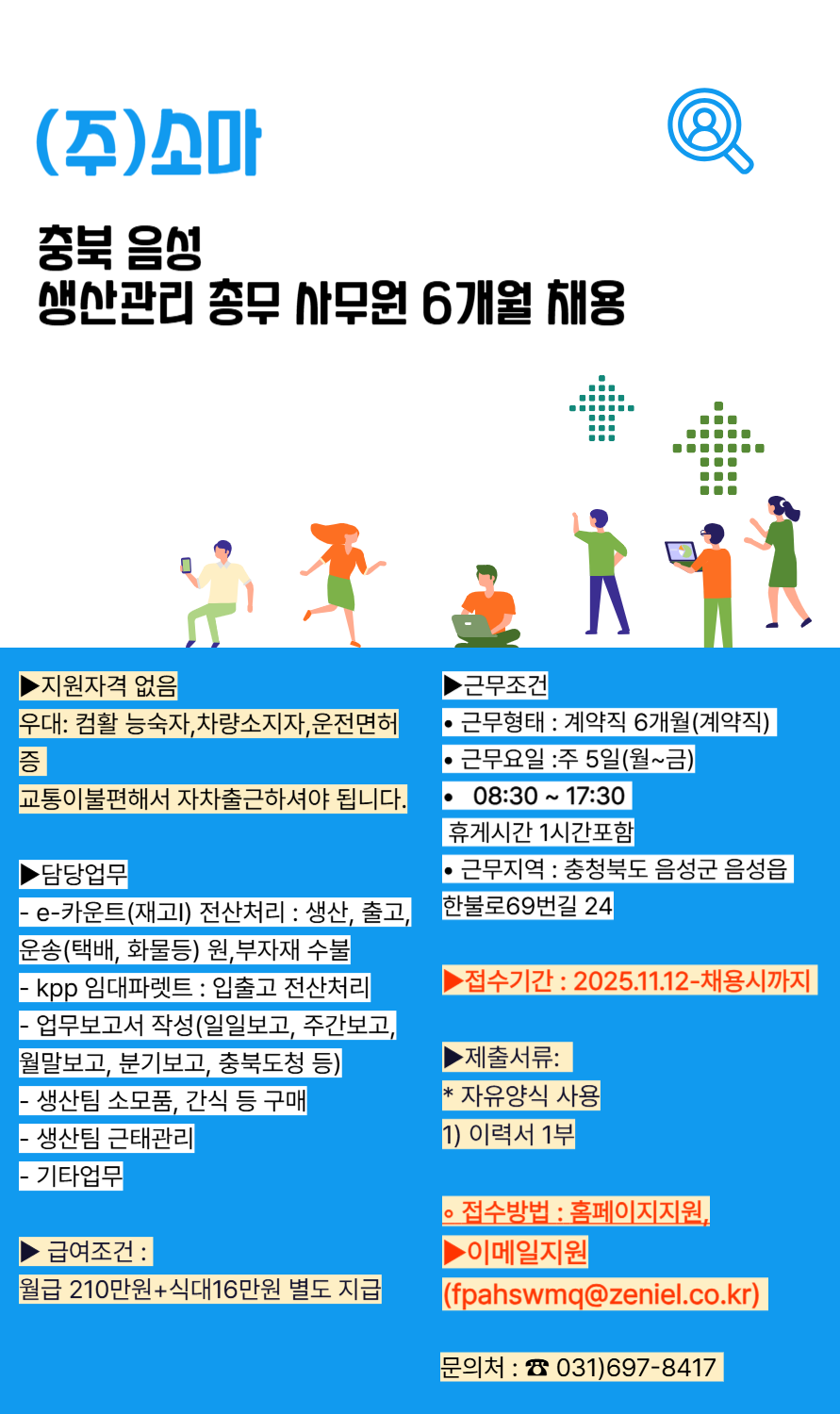 [(ÁÖ)¼Ò¸¶] ÃæºÏ À½¼º »ý»ê°ü¸® Ãѹ« »ç¹«¿ø 6°³¿ù ä¿ë(ÈÞÁ÷´ëü)