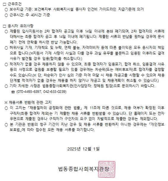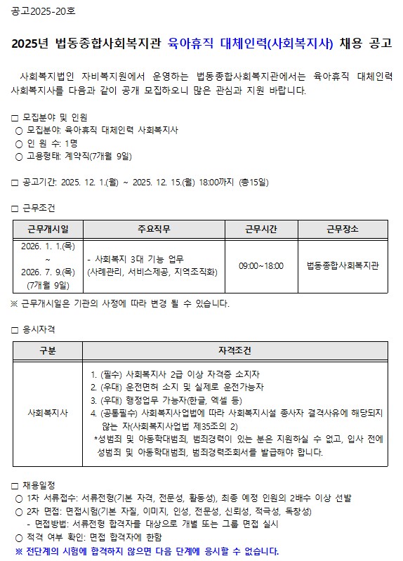 2025³â ¹ýµ¿Á¾ÇÕ»çȸº¹Áö°ü À°¾ÆÈÞÁ÷ ´ëüÀηÂ(»çȸº¹Áö»ç) ä¿ë °ø°í
