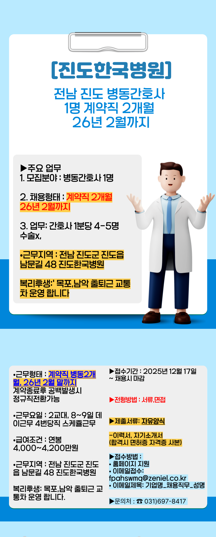 [ÁøµµÇѱ¹º´¿ø] Àü³² Áøµµ º´µ¿°£È£»ç 1¸í °è¾àÁ÷ 2°³¿ù 26³â 2¿ù±îÁö, ä¿ë°ø°í(ÈÞÁ÷´ëü)