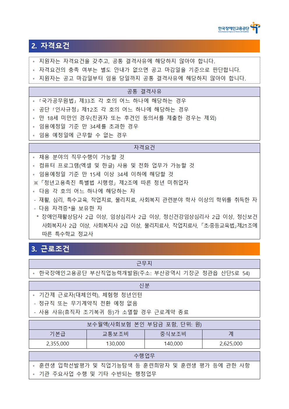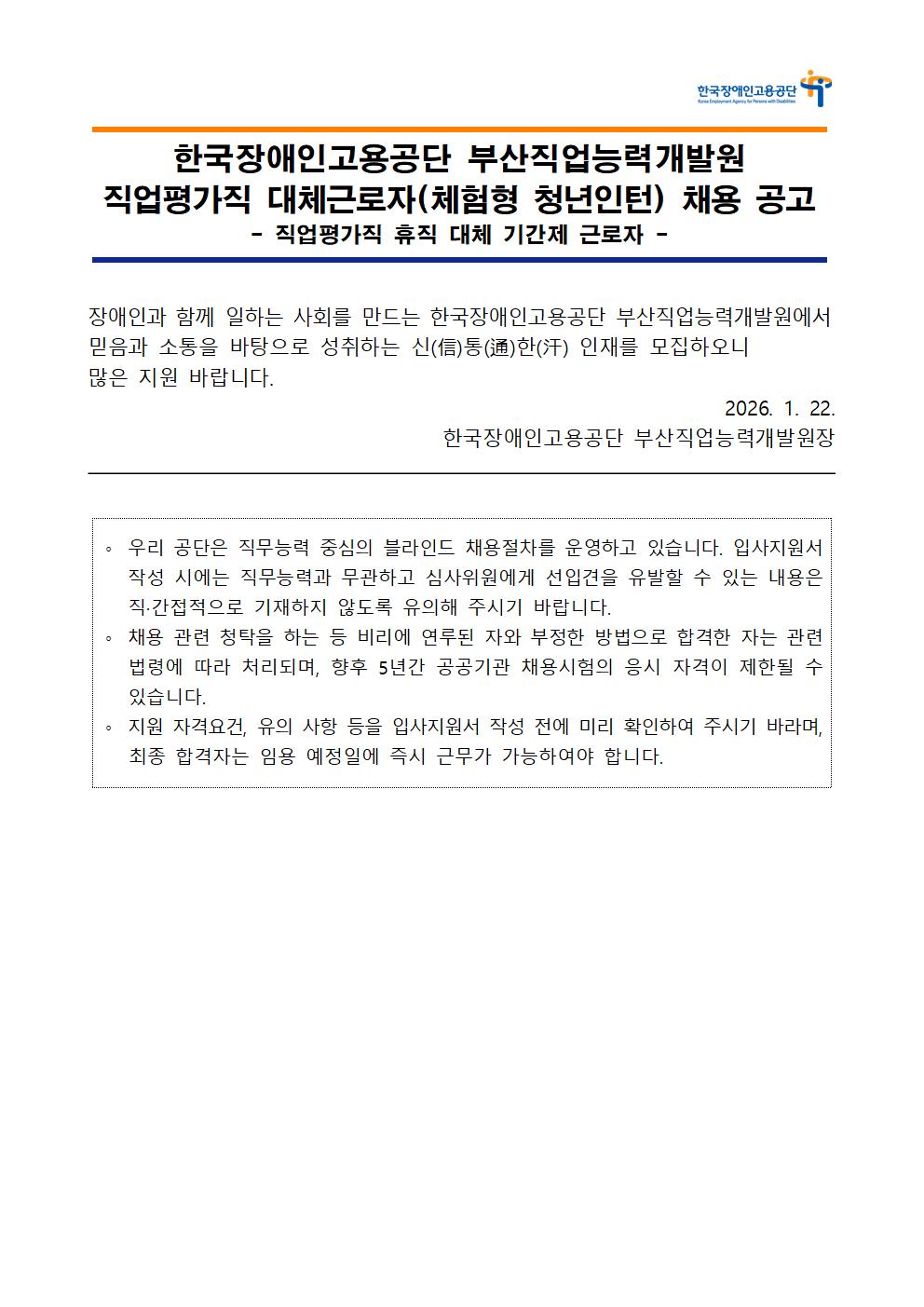 Çѱ¹Àå¾ÖÀΰí¿ë°ø´Ü ºÎ»êÁ÷¾÷´É·Â°³¹ß¿ø Á÷¾÷Æò°¡Á÷ ´ëü±Ù·ÎÀÚ(üÇèÇü û³âÀÎÅÏ) ä¿ë °ø°í - Á÷¾÷Æò°¡Á÷