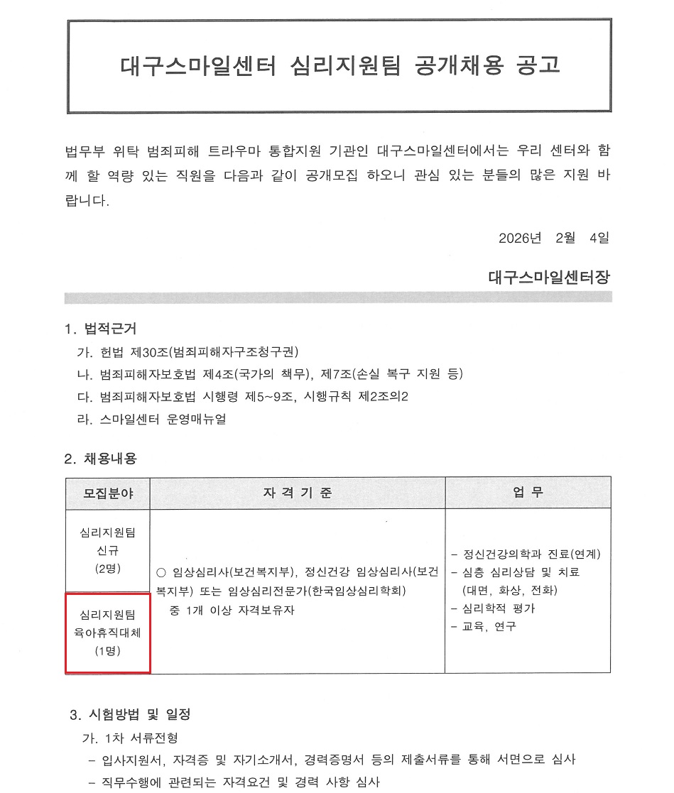 ¹ý¹«ºÎ À§Å¹ [´ë±¸½º¸¶Àϼ¾ÅÍ] ½É¸®Áö¿øÆÀ ´ëüÁ÷(À°¾ÆÈÞÁ÷) ä¿ë °ø°í