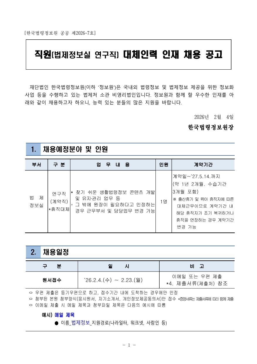 ÇÕ°Ý ÈÄ Ã¤¿ë ½Ã, (Àç)Çѱ¹¹ý·ÉÁ¤º¸¿ø ¼Ò¼Ó °è¾àÁ÷À¸·Î ±Ù¹«ÇÏ°Ô µË´Ï´Ù.