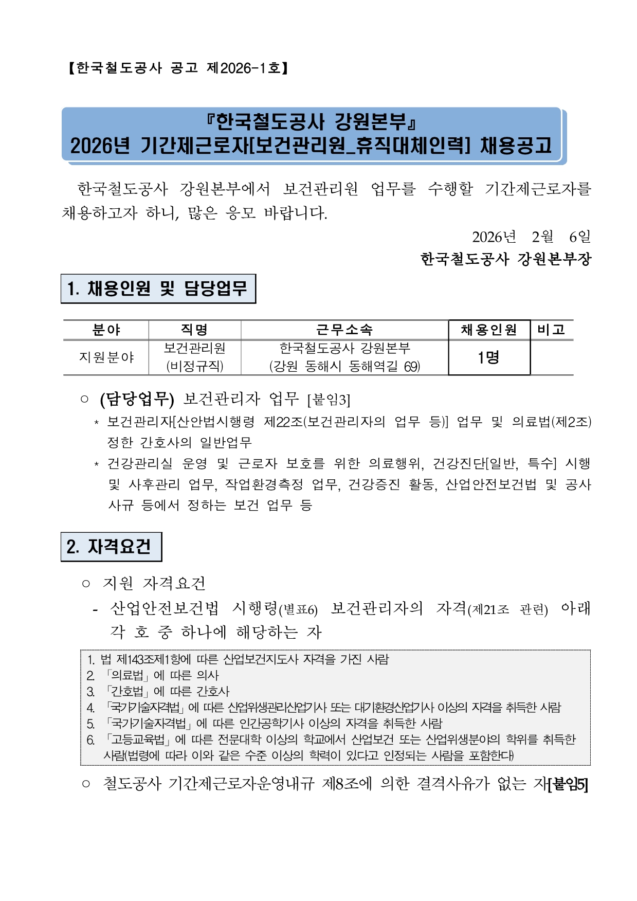 [Çѱ¹Ã¶µµ°ø»ç °­¿øº»ºÎ] 2026³â ±â°£Á¦±Ù·ÎÀÚ(º¸°Ç°ü¸®¿ø_ÈÞÁ÷´ëüÀηÂ) ä¿ë°ø°í