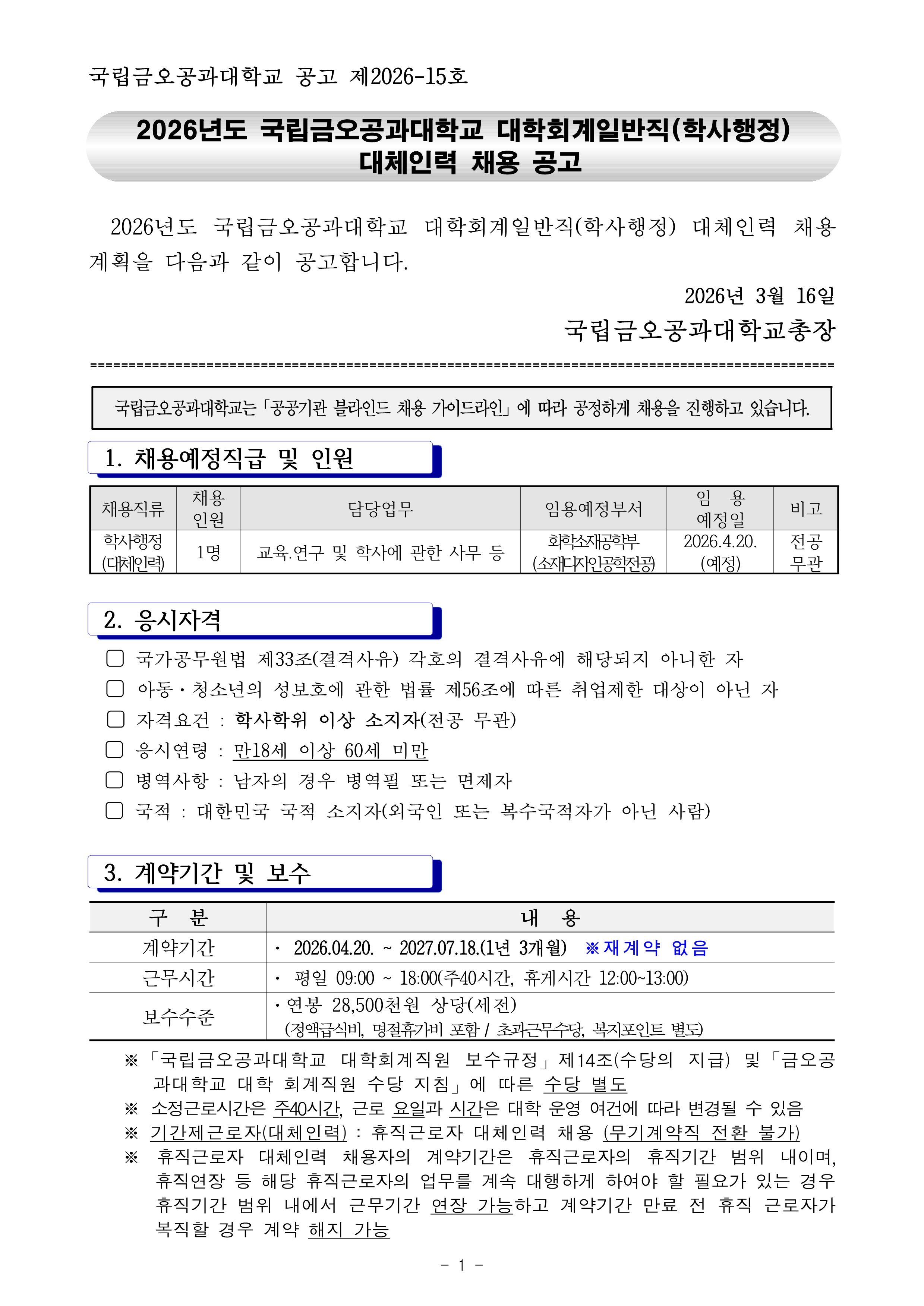 [°æºÏ ±¸¹Ì]±¹¸³±Ý¿À°ø°ú´ëÇб³ ´ëÇÐȸ°èÀϹÝÁ÷(ÇлçÇàÁ¤) ´ëüÀη ä¿ë °ø°í