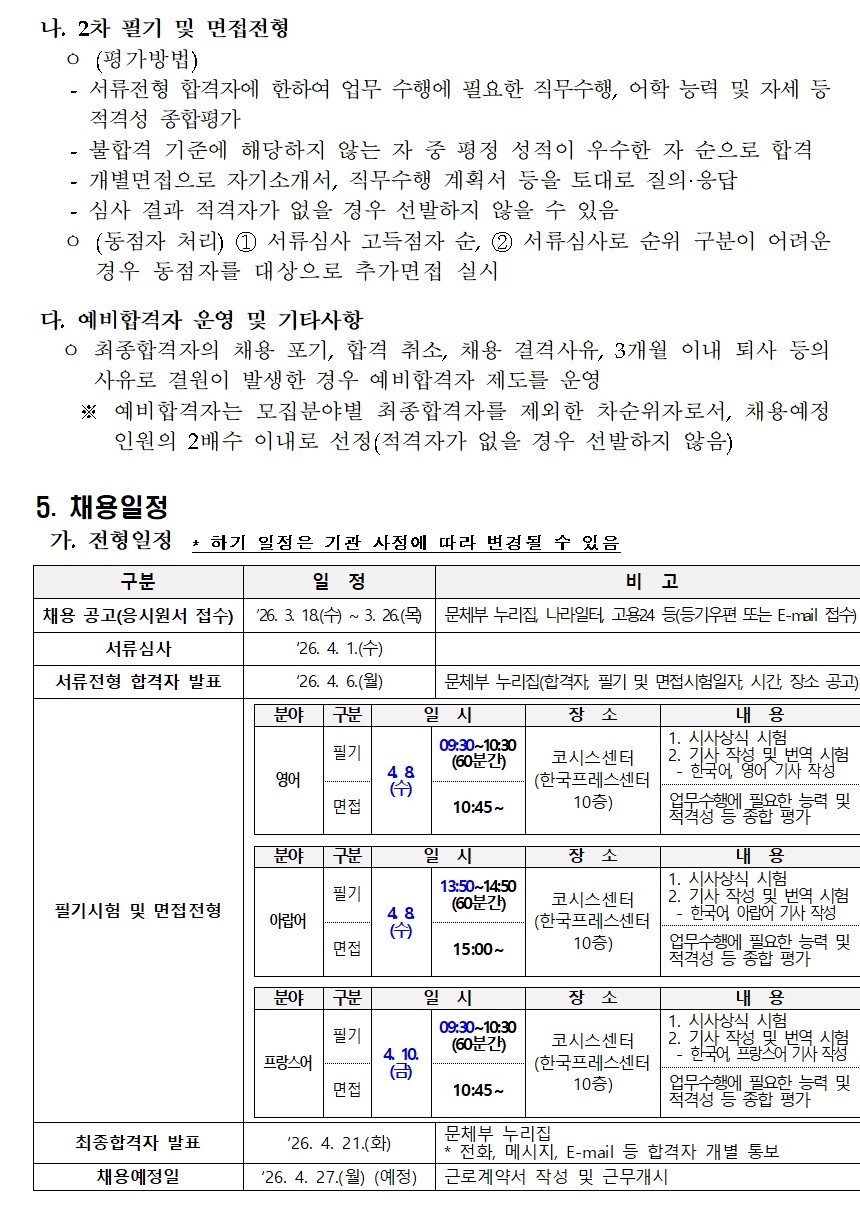 [¹®È­Ã¼À°°ü±¤ºÎ ÇØ¿ÜÈ«º¸ÄÜÅÙÃ÷°ú] °ø¹«Á÷ ¹× ±â°£Á¦±Ù·ÎÀÚ Ã¤¿ë °ø°í(ÈÞÁ÷´ëü/¿µ¾î,¾Æ¶ø¾î,ÇÁ¶û½º¾î)