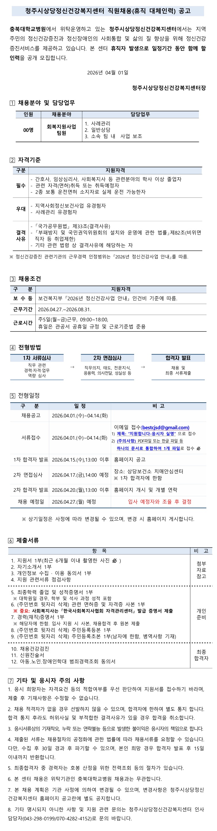 [ûÁֽûó´çÁ¤½Å°Ç°­º¹Áö¼¾ÅÍ] ȸº¹Áö¿ø»ç¾÷ ÆÀ¿ø(ÈÞÁ÷ ´ëü) ä¿ë