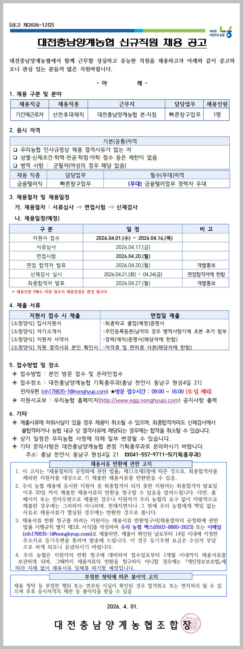 ÇÕ°Ý ÈÄ Ã¤¿ë ½Ã, '´ëÀüÃæ³²¾ç°è³óÇùÁ¶ÇÕ' ¼Ò¼ÓÀ¸·Î ±Ù¹«ÇÏ°Ô µË´Ï´Ù.
