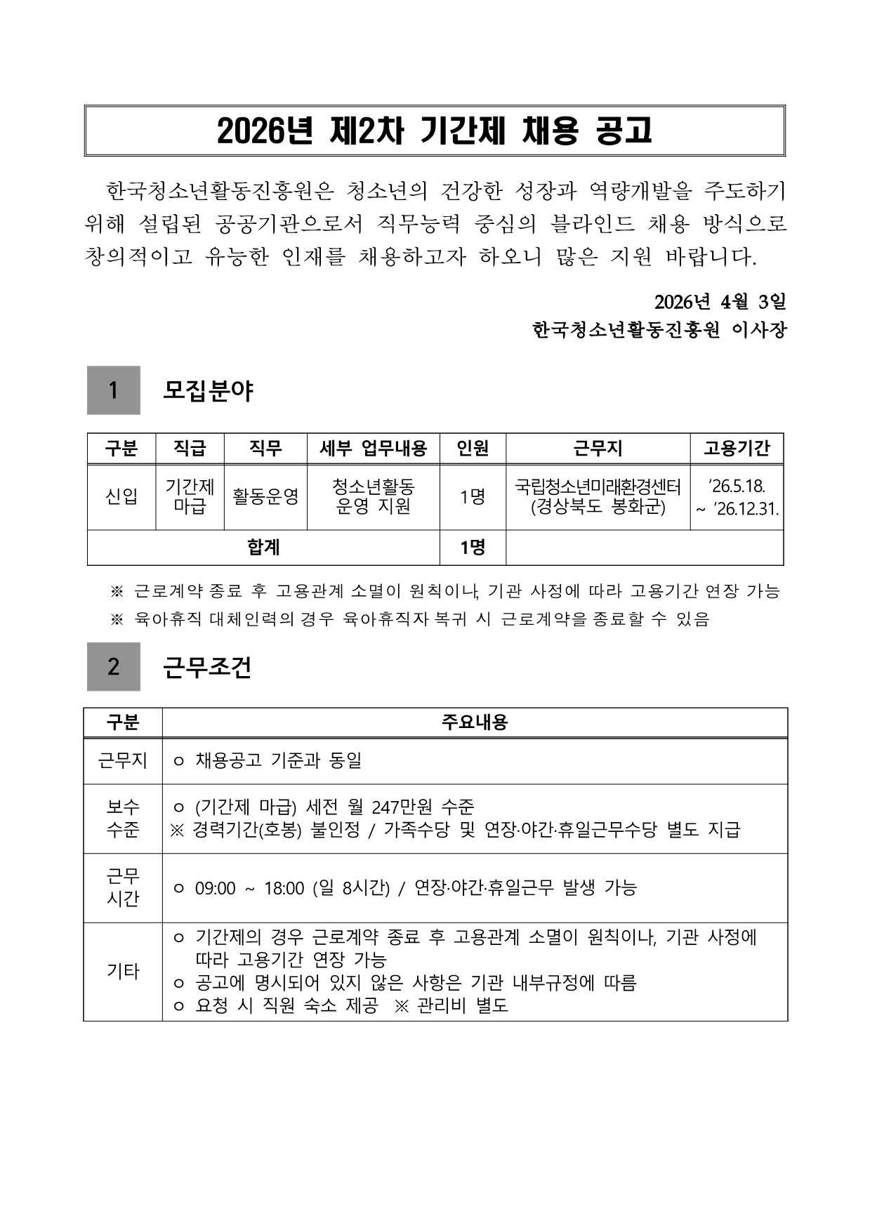 2026³â Á¦2Â÷ ±¹¸³Ã»¼Ò³â¹Ì·¡È¯°æ¼¾ÅÍ Á÷¿ø(±â°£Á¦) ä¿ë °ø°í