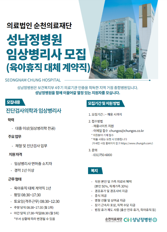 [ÀÇ·á¹ýÀÎ ¼øÃµÀÇ·áÀç´Ü] ¼º³²Á¤º´¿ø ÀÓ»óº´¸®»ç ä¿ë °ø°í (À°¾ÆÈÞÁ÷ ´ëü)