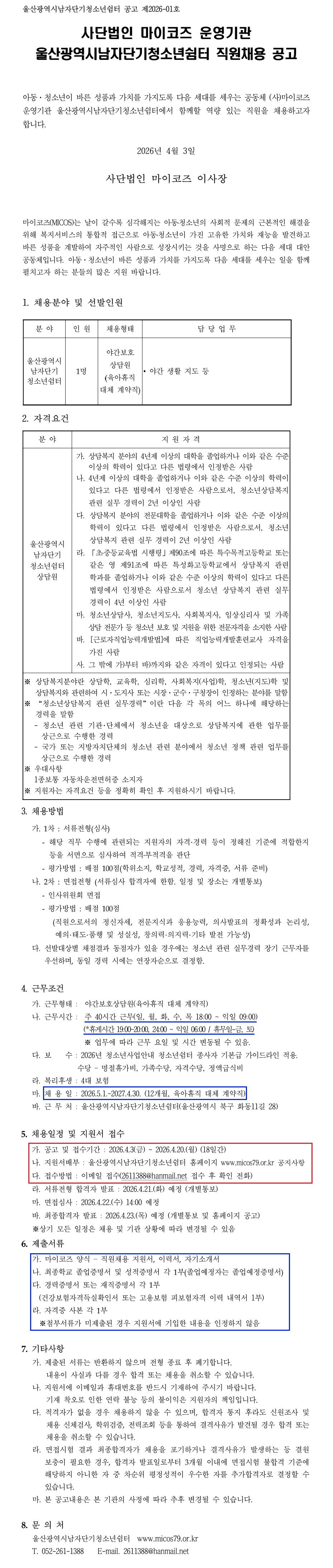 [¿ï»ê±¤¿ª½Ã³²Àڴܱâû¼Ò³â½°ÅÍ]¾ß°£ º¸È£»ó´ã¿ø ä¿ë°ø°í(À°¾ÆÈÞÁ÷ ´ëü)