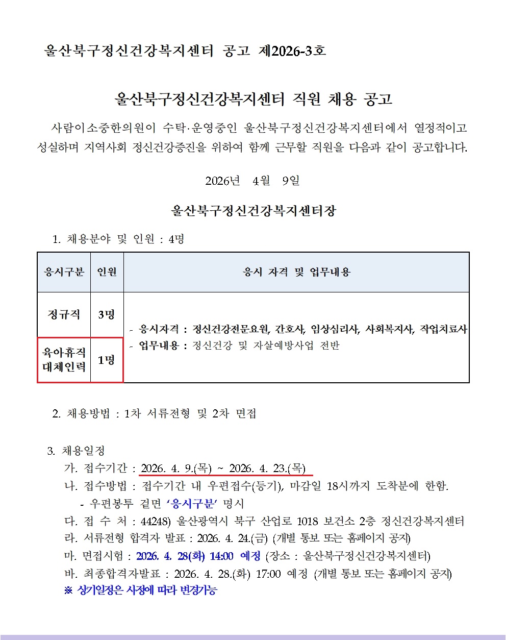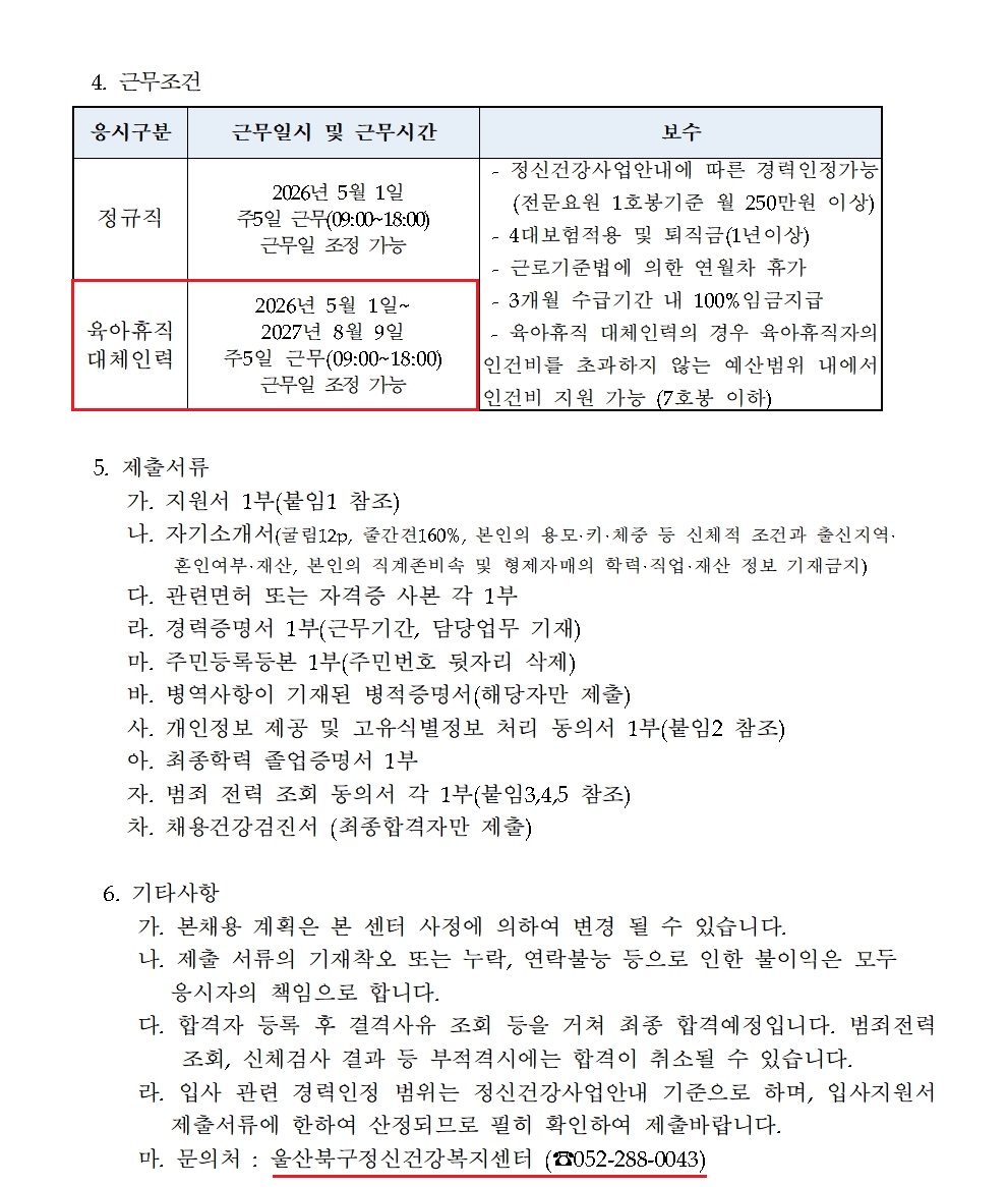 [¿ï»êºÏ±¸Á¤½Å°Ç°­º¹Áö¼¾ÅÍ] Á¤½Å°Ç°­Àü¹®¿ä¿ø ´ëüÁ÷(À°¾ÆÈÞÁ÷) ä¿ë °ø°í