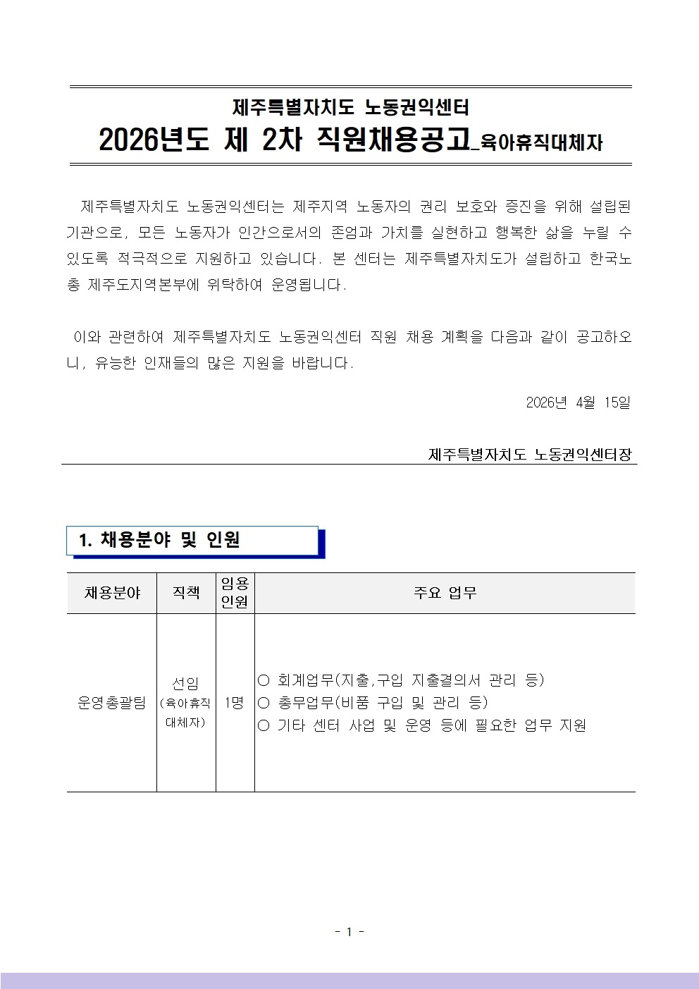 [Á¦ÁÖÆ¯º°ÀÚÄ¡µµ ³ëµ¿±ÇÀͼ¾ÅÍ]2026³âµµ Á¦2Â÷ Á÷¿øÃ¤¿ë°ø°í(À°¾ÆÈÞÁ÷´ëü)