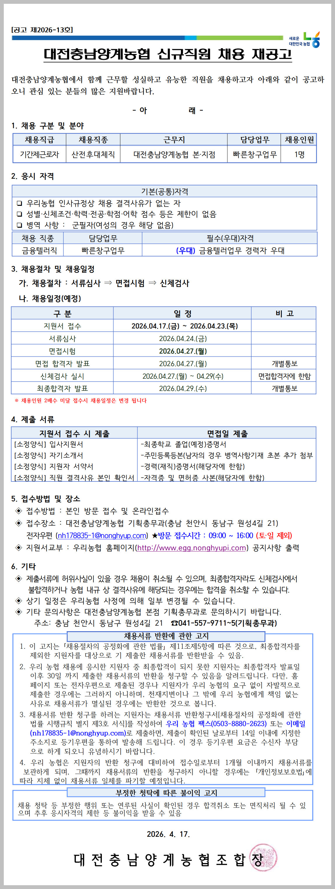 ÇÕ°Ý ÈÄ Ã¤¿ë ½Ã, '´ëÀüÃæ³²¾ç°è³óÇùÁ¶ÇÕ' ¼Ò¼ÓÀ¸·Î ±Ù¹«ÇÏ°Ô µË´Ï´Ù.